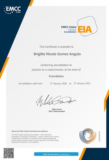 Certificación internacional otorgada por EMCC Global (European Mentoring & Coaching Council) que acredita a Brigitte Nicole Gomez Angulo para ejercer como coach y mentora a nivel Foundation. Esta acreditación reconoce el cumplimiento de estándares profesionales internacionales en mentoring y coaching.