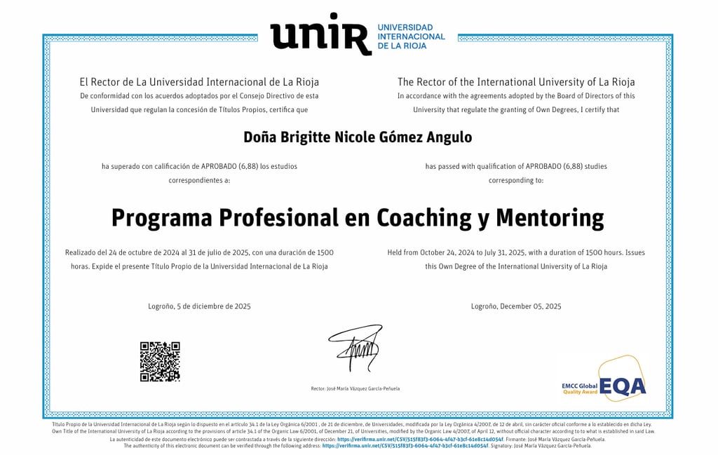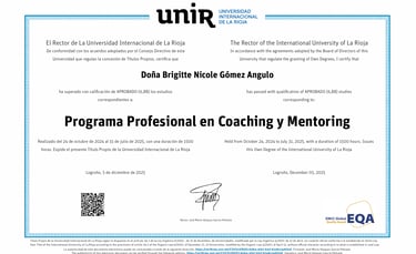 Título propio expedido por la Universidad Internacional de La Rioja (UNIR) que certifica la finalización del Programa Profesional en Coaching y Mentoring, con una duración de 1500 horas. Este programa proporciona formación especializada en metodologías y herramientas profesionales de coaching y mentoring.